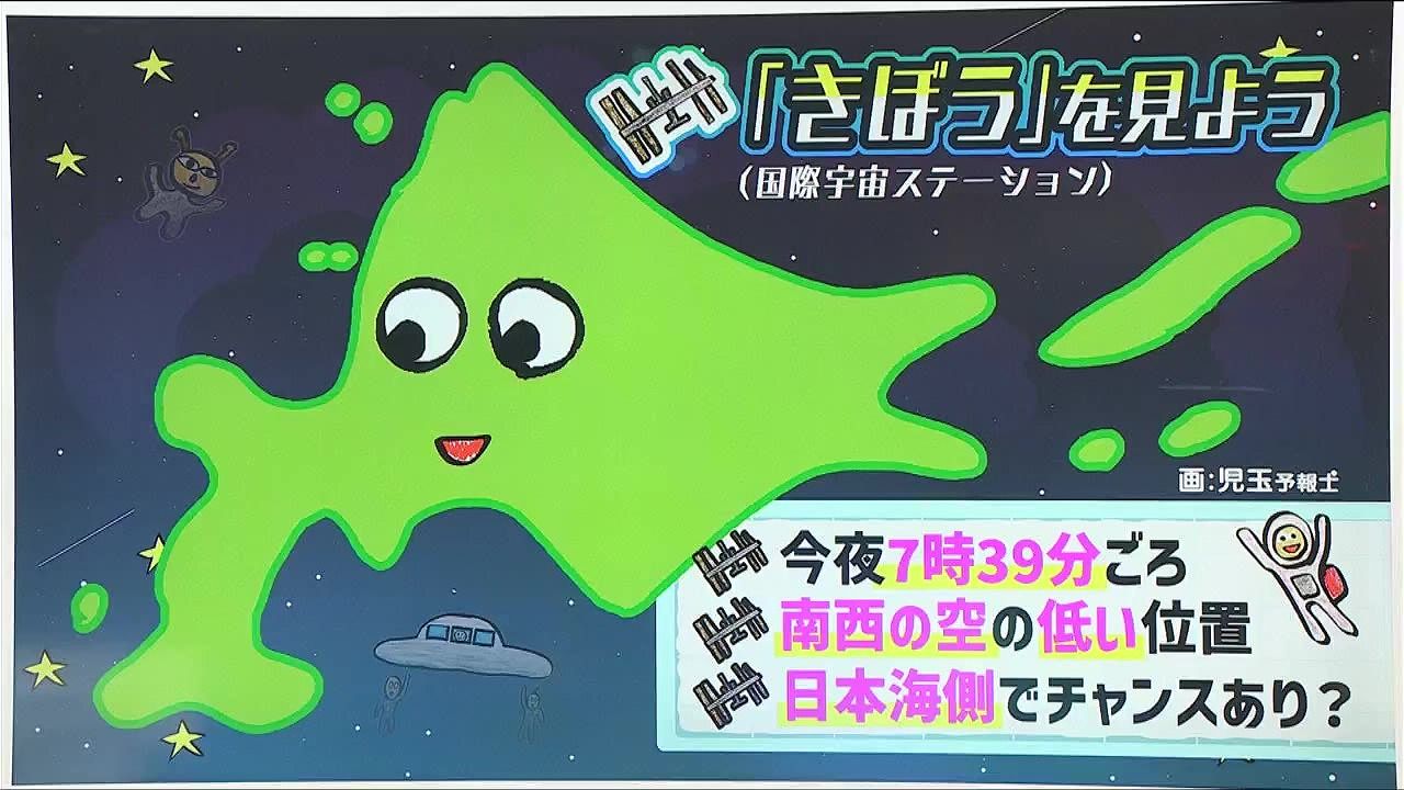 午後7時39分ころからおよそ4分間、日本の上空を通過します。北海道では南西の空の低い位置を通るので、開けた場所で見るのがおすすめです。また、月の近くを通るので、まずは月を探すといいですよ。問題の天気は、雲が広がりやすいですが、札幌を含む日本海側では見られる可能性がありますよ。
