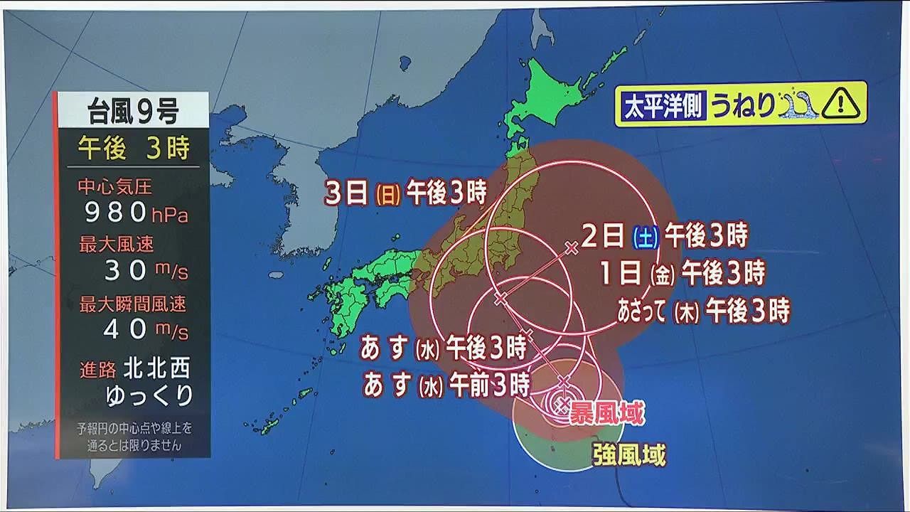 南海上の台風9号はゆっくりと北上し、予報円の中心を通ると、2日土曜に伊豆諸島に達した後、進路を東に変えそうです。予報円が大きく、まだはっきりしませんが、土日は関東などに接近するおそれがあります。今後も最新情報を確認して下さい。