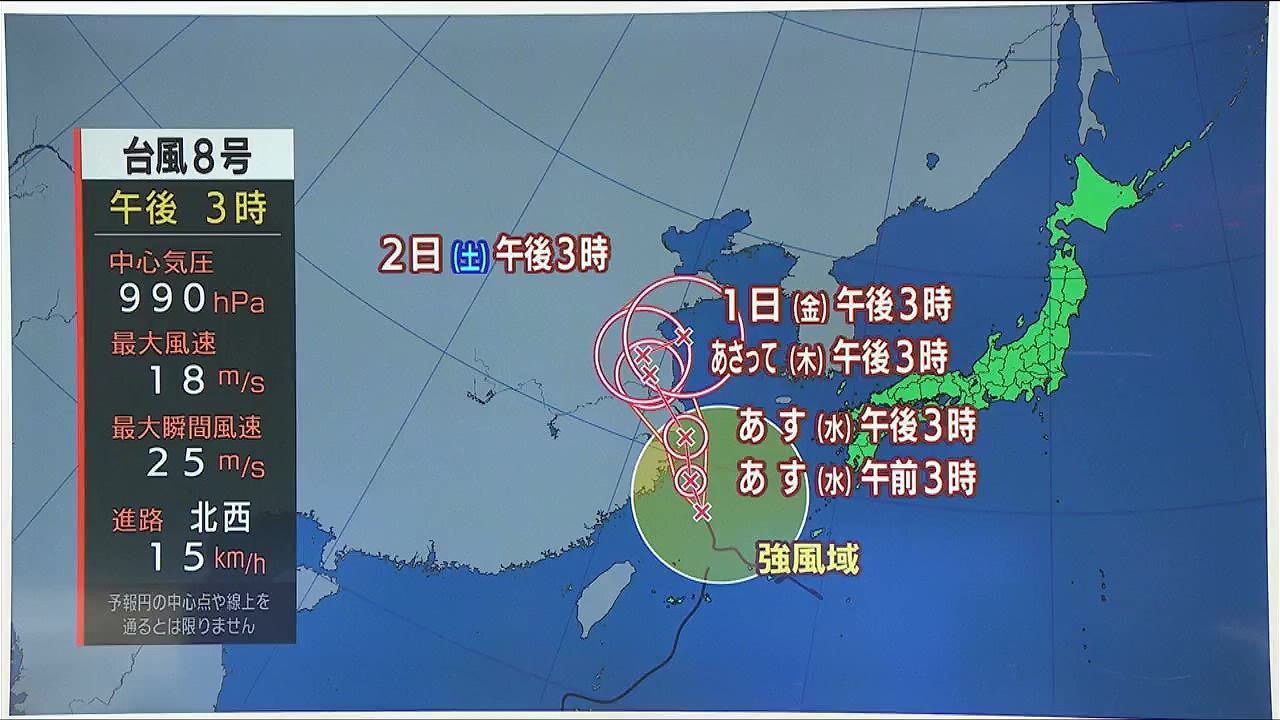 日本付近に2つの台風があります。まず、東シナ海にある台風8号は大陸へ進み、土曜日に熱帯低気圧に変わるでしょう。