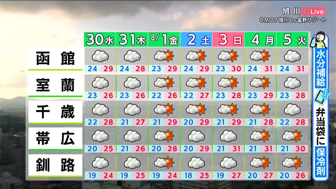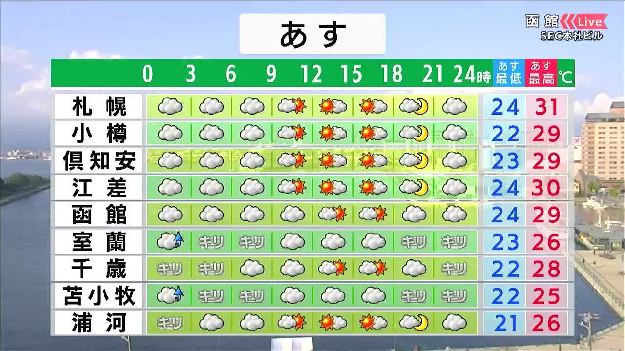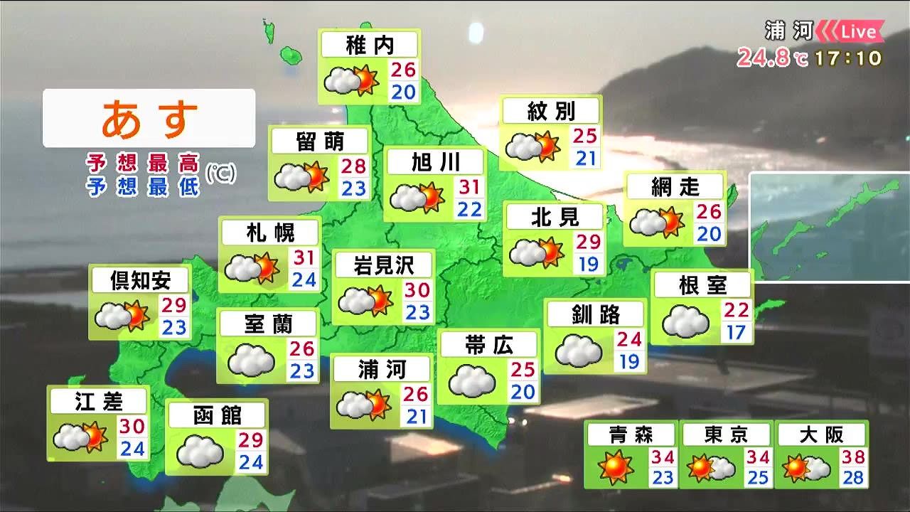 札幌や倶知安などは、強い日差しが照り付けます。函館も日が差しますが、室蘭や苫小牧は霧がかかります。蒸し暑さが続くため、室内でも風通しをよくしましょう。
