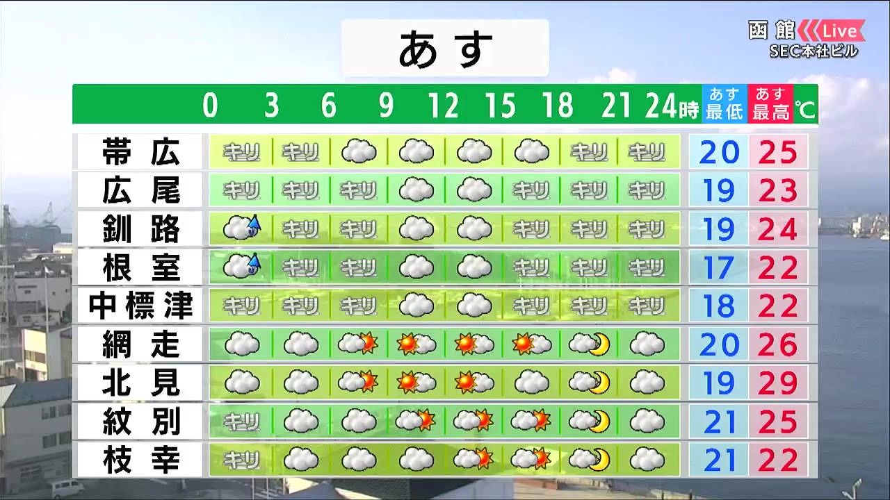 道東は日中でも濃い霧がかかり、根室の最高気温は22度と涼しいでしょう。オホーツク海側は晴れて、北見はきょう29日(火)より4度高い29度まで気温が上がります。