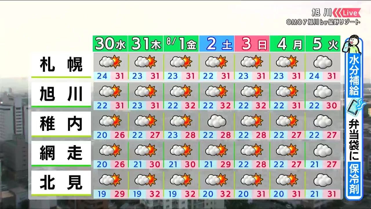旭川ではあさって木曜から3日間、旭川夏まつりが開催されます。期間中、天気の大きな崩れはないですが、暑さ対策が必要です。