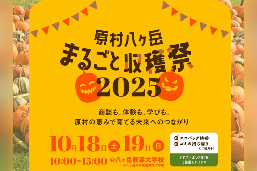2025年10月18日(土)、10月19日(日)に長野県諏訪郡原村の「八ヶ岳農業大学校」で『原村八ヶ岳まるごと収穫祭2025』が6年ぶりに開催。地元の食材を使ったグルメが並ぶマルシェのほか、『動物ふれあい農場ツアー』や、同校で採れたハロウィンかぼちゃを使ったジャックオーランタン作りなど、大人から子どもまで楽しめる企画がそろいます。また、会場各所には、ハロウィンらしいフォトスポットも用意。仮装して来場するとお菓子がもらえますよ。