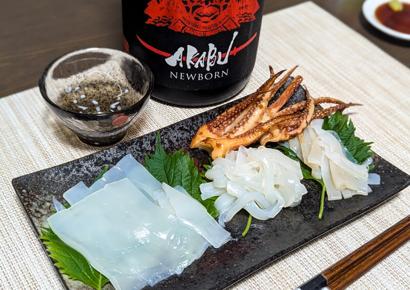 数時間漬けたら、あとはさばいてお皿に盛り付けるだけ。イカの身全体にタレが染み込み、格別なお刺身が味わえます。