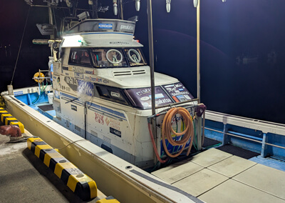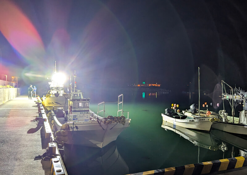 今回は日没後の出港ということもあり、集合場所に着いたときにはすでに暗くなっていました。タックルや仕掛を準備するのにライトがあると便利です。