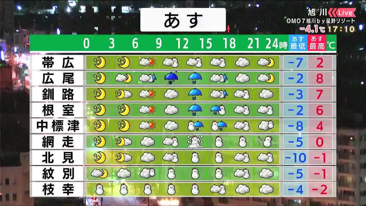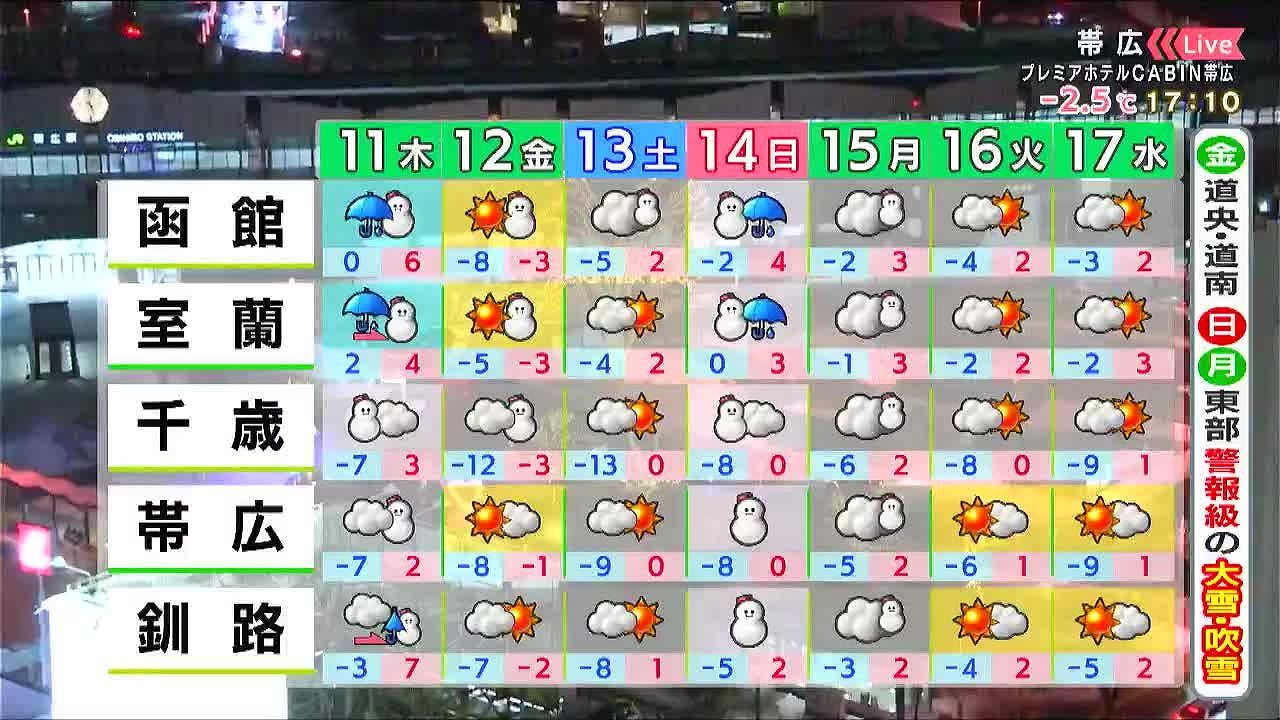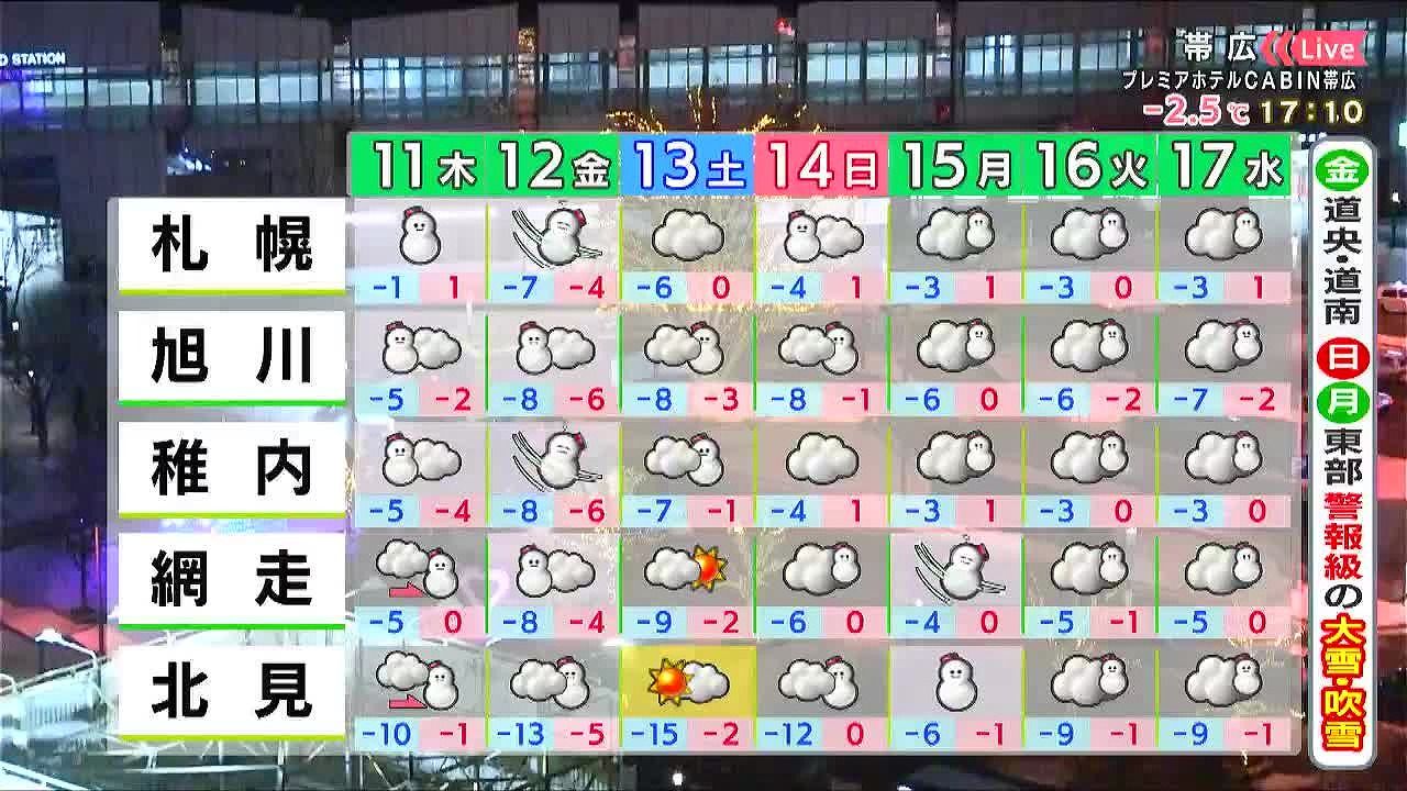 金曜も雪や風が強く、札幌周辺など道央で警報級の大雪や猛吹雪となるおそれがあります。また、金曜はこの冬一番の寒さです。日曜は札幌周辺で再び雪が強まり、月曜はオホーツク海側で荒れるでしょう。