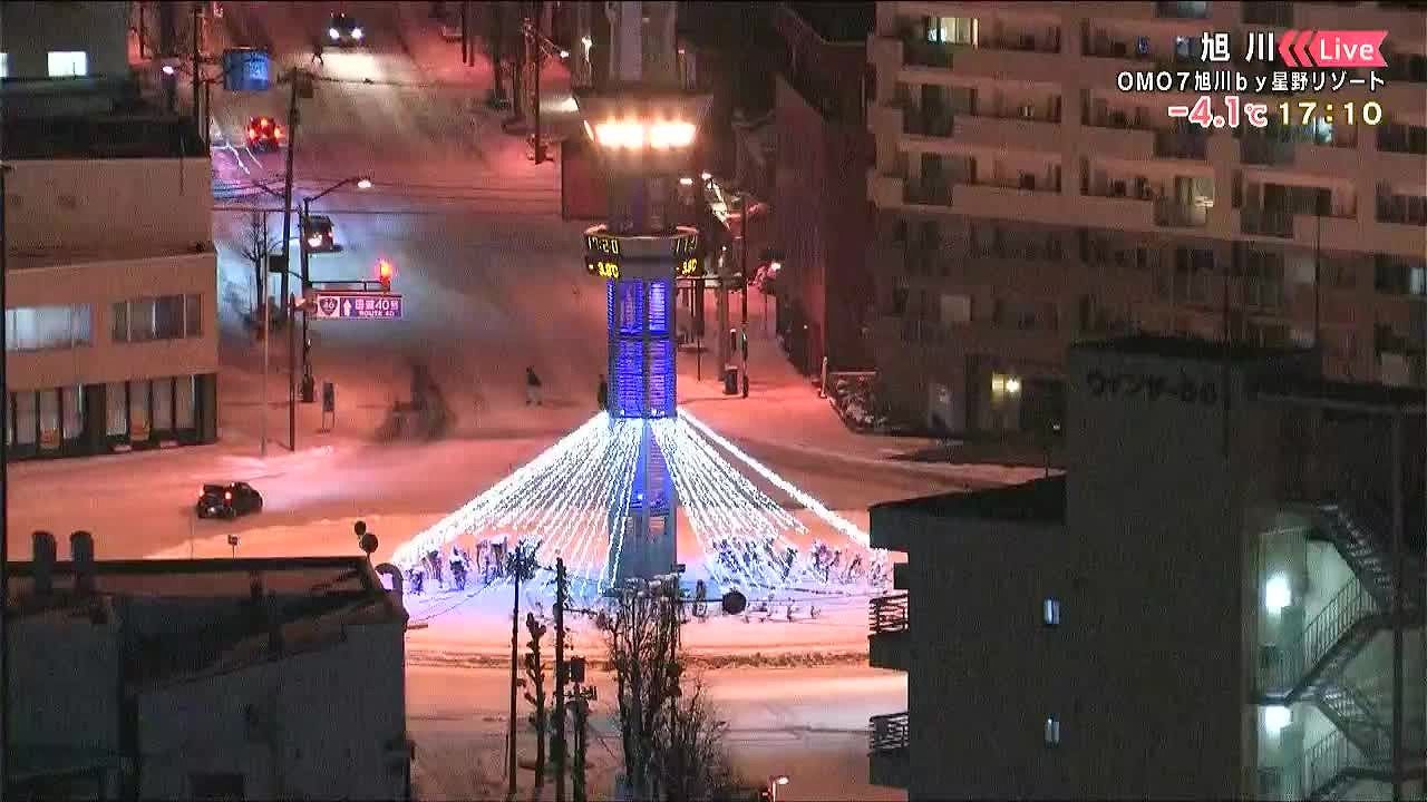 旭川です。穏やかですが、路面は真っ白です。ツルツル路面に注意して下さい。