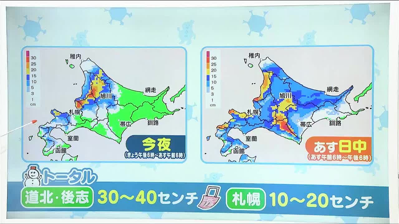 あす夕方までのトータルで見ると、上川北部や留萌など道北や後志で40センチ近い大雪に、札幌もあすの日中以降20センチ近い雪が降りそうです。