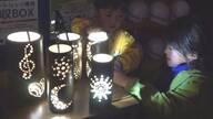 材料にはモウソウチクを使用し、サイズも色も同じものは2つとないため、彫り方や絵の写し方には一つひとつ調整が必要。わずかに竹の皮を残す「透かし彫り」で濃淡をつけたり、色紙を裏向きに貼ってあんどんの光で色付けしたりと、光の効果を加えて独自の表現ができるのが竹あんどんの魅力だそうだ。