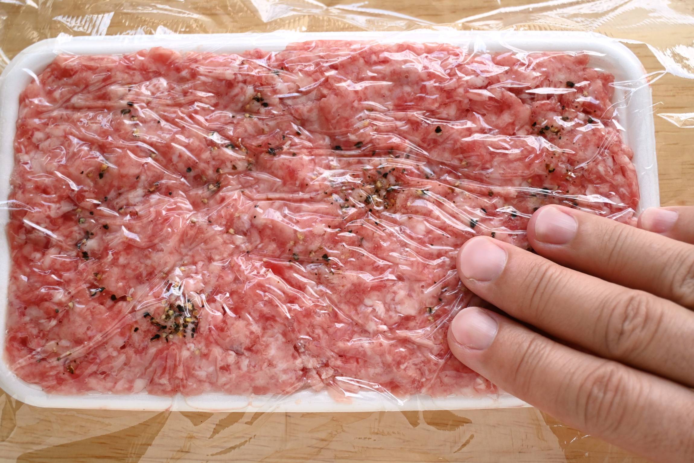 トレーに入ったひき肉の表面に半量の塩と粗挽き黒こしょうを振り、ラップで覆います。肉の間の空気を抜くように、ラップの上から手で押し固めます。