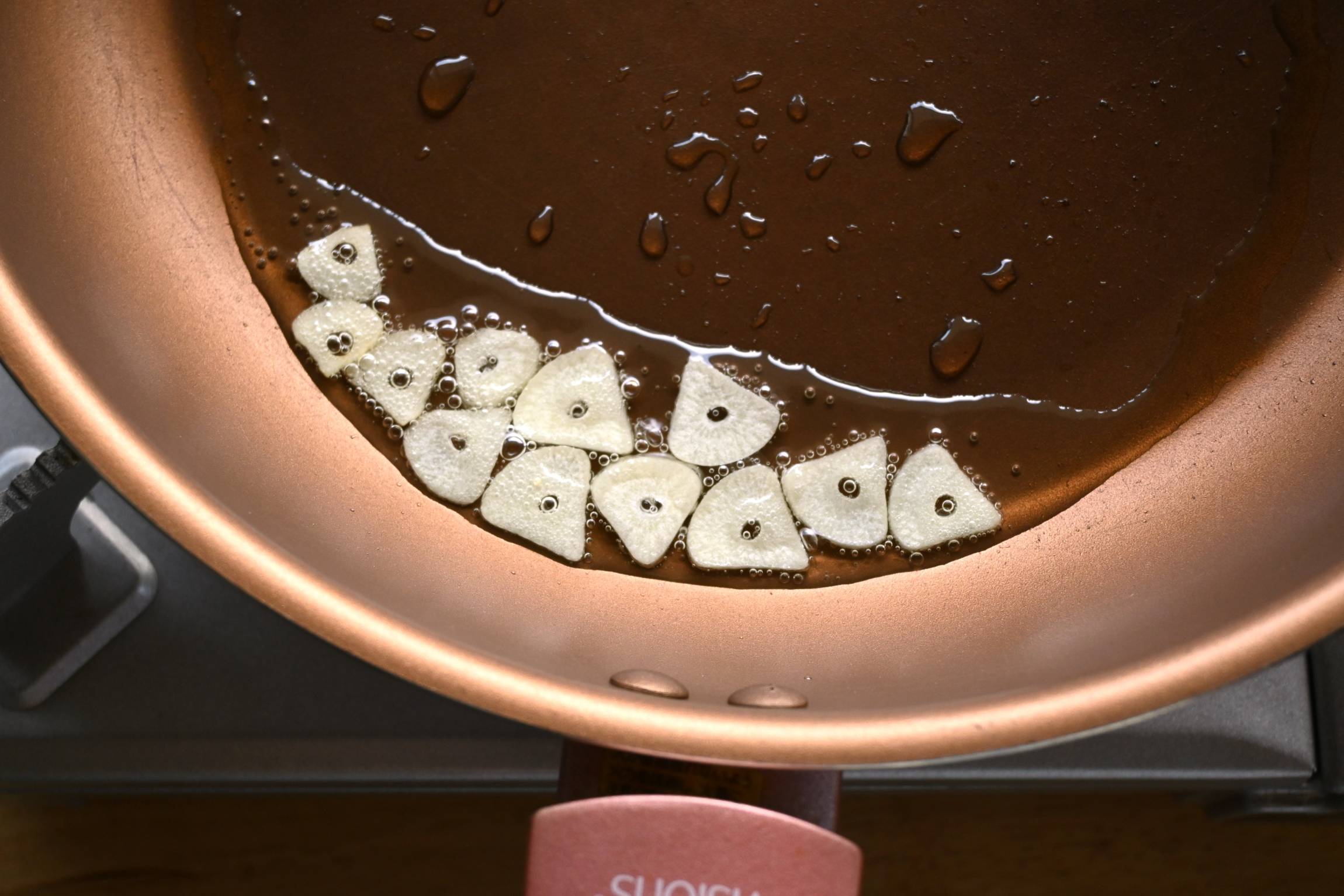フライパンにサラダ油を熱し、にんにくを入れます。にんにくが油に浸るようにフライパンを手前に傾けます。にんにくの縁に泡が出てきたら火を弱めて薄く色づくまで熱します。