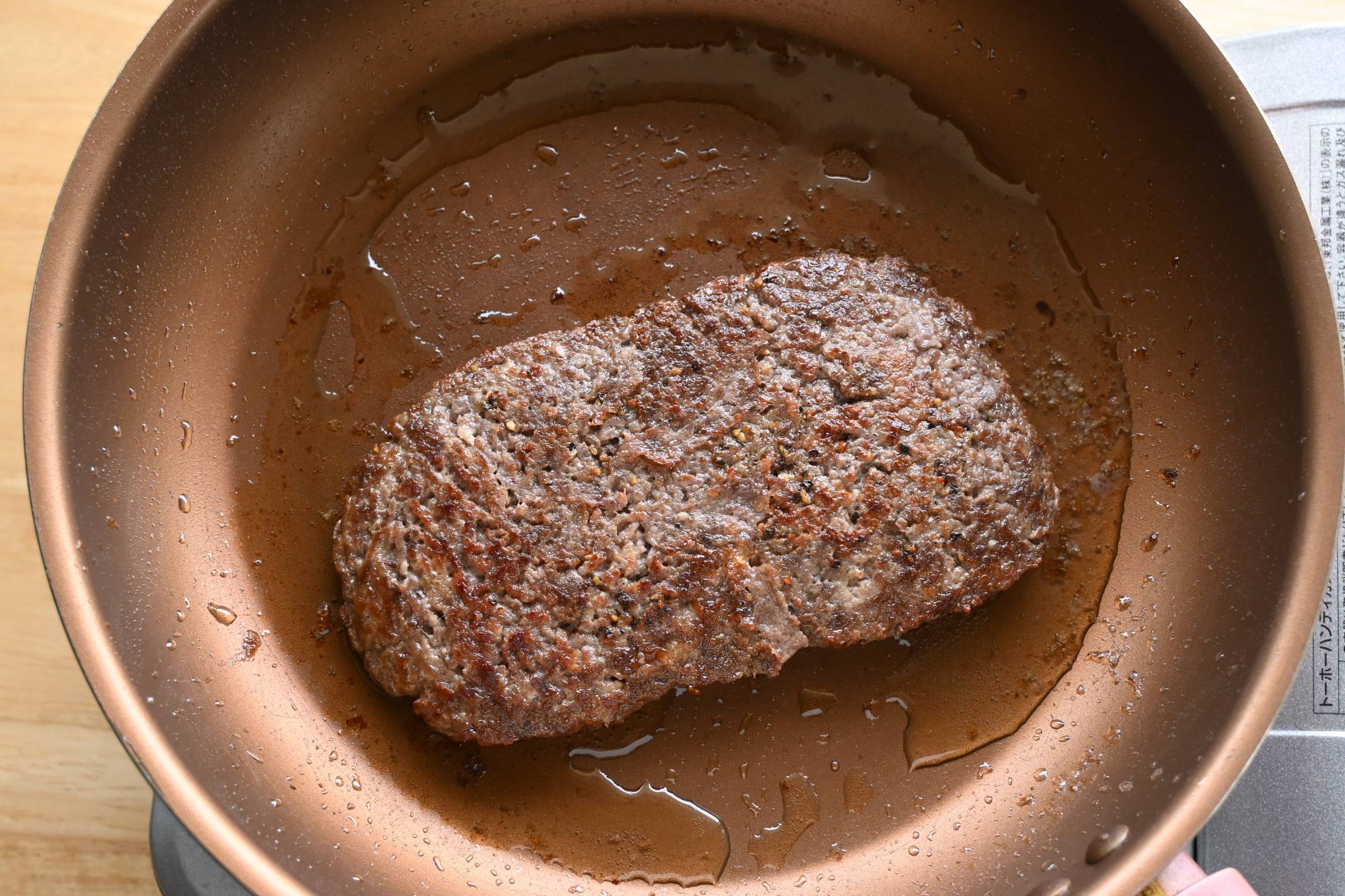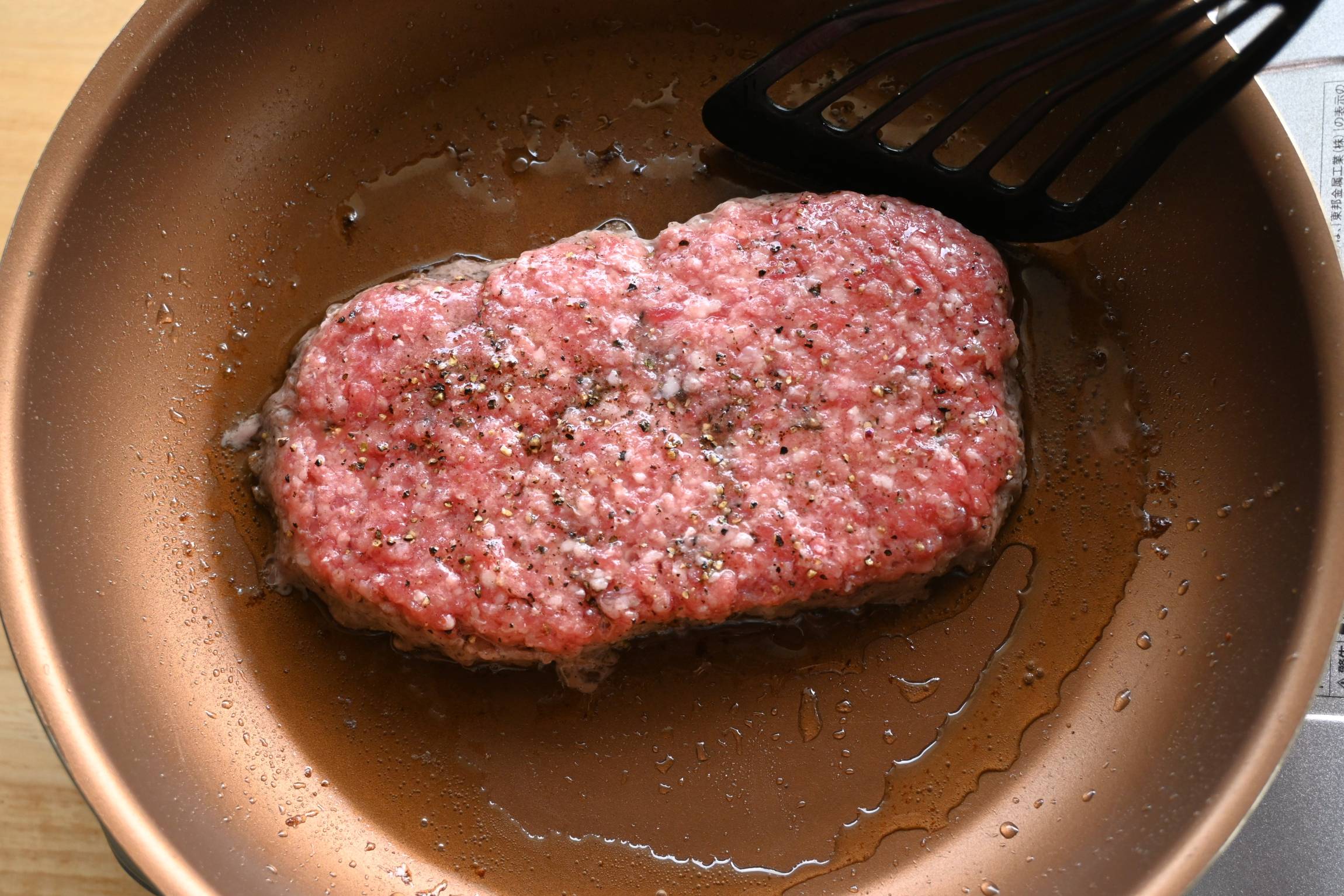 中火で熱したフライパンの上でトレーをひっくり返し、塩こしょうをした面が下になるように肉をのせます。上の面にも残りの塩こしょうを振り、ヘラで形を整えながら焼いていきます。