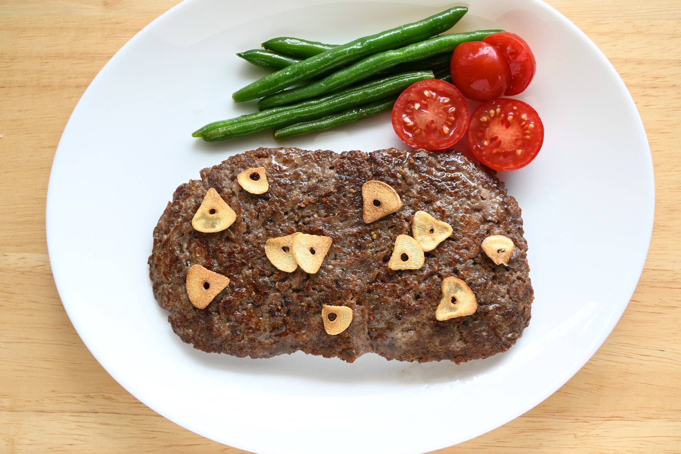 ひき肉はトレー容器でそのまま成形するのでとっても簡単!一般的なステーキ肉とはひと味違い、ふんわりとしたやわらかい食感と噛みごたえのバランスが絶妙です。