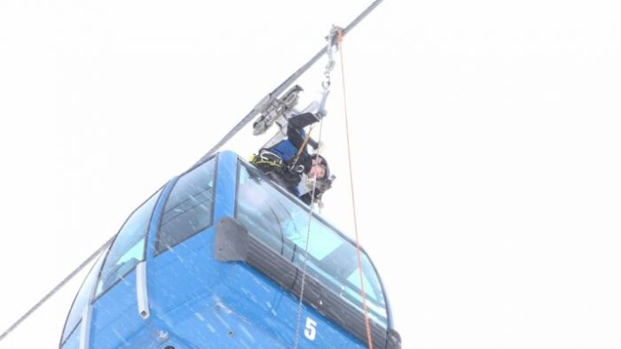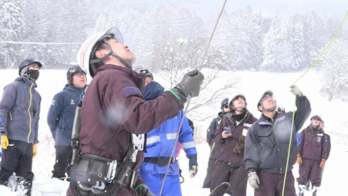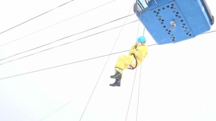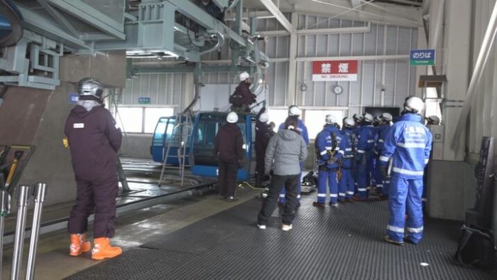 そこから扉を開け、乗客に救助用のベルトの装着を促し、救出用のロープを使って、スキー客を地上に下ろしました。