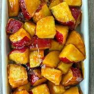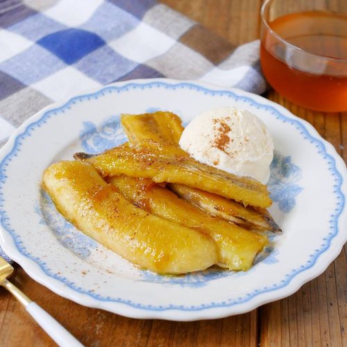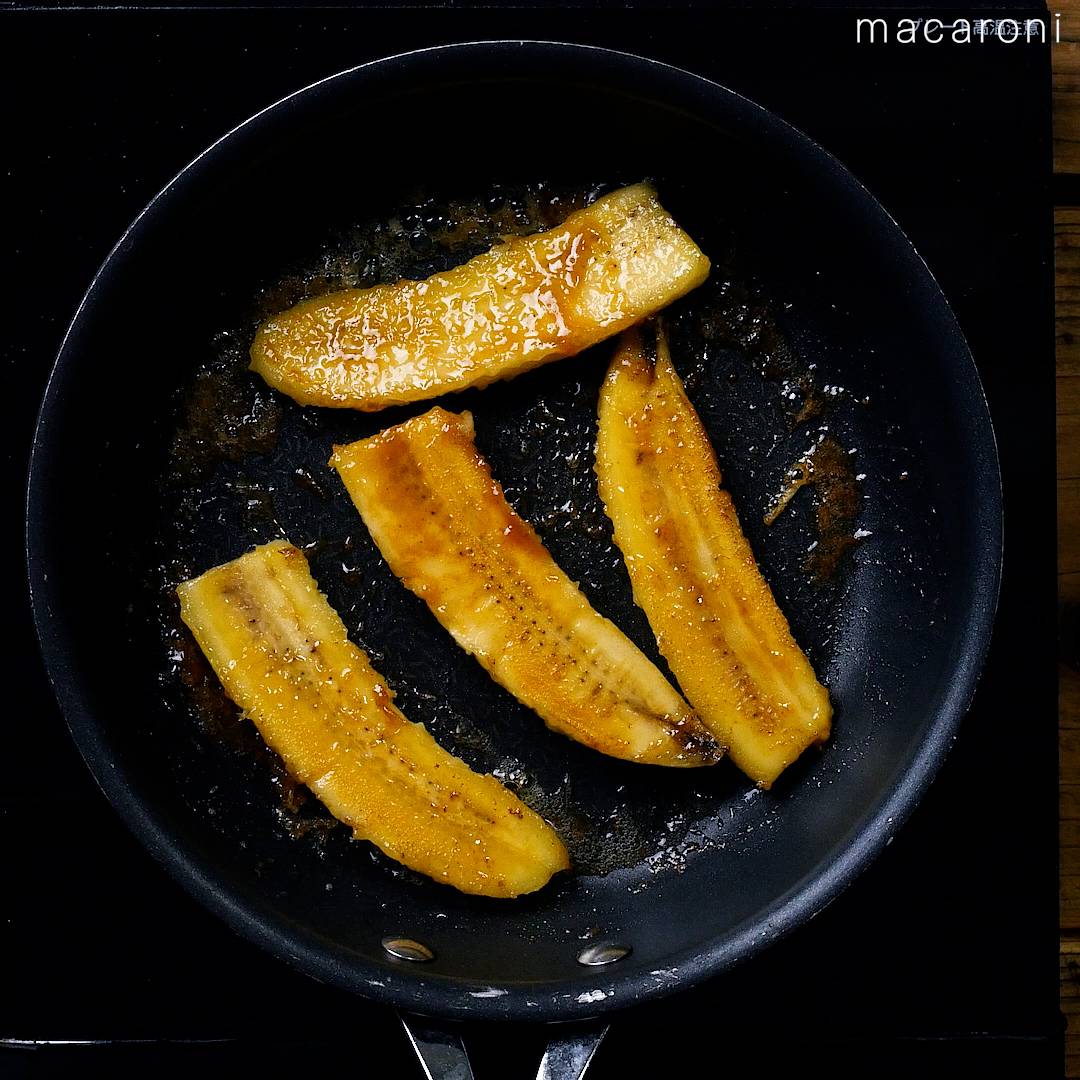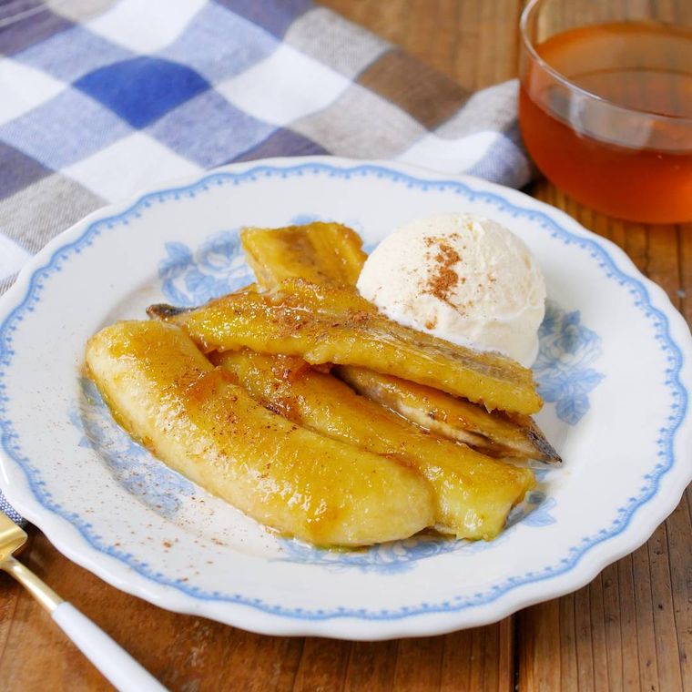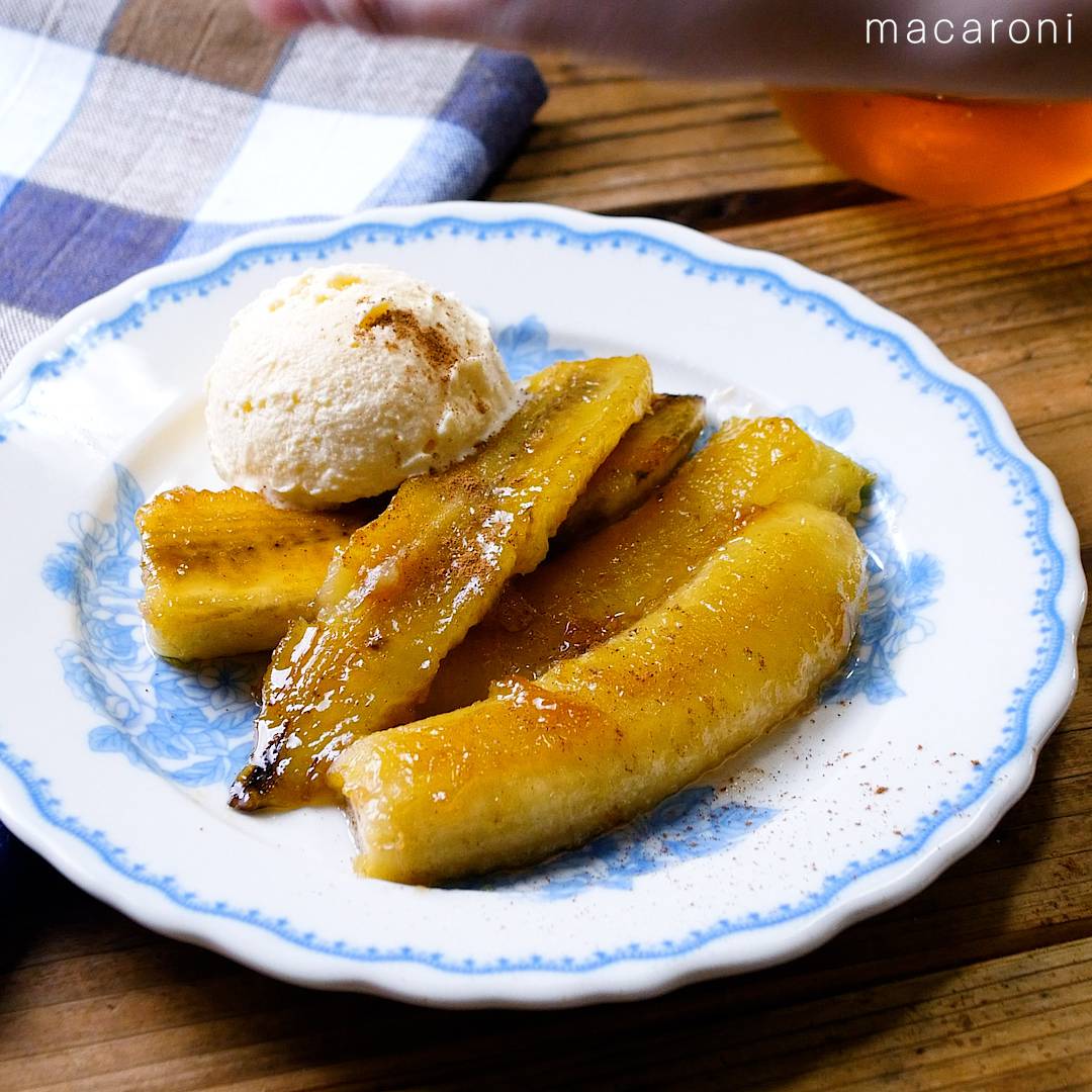 4: 中火で全体に絡めて取り出し、お好みでバニラアイス、シナモンパウダーをトッピングして完成です。