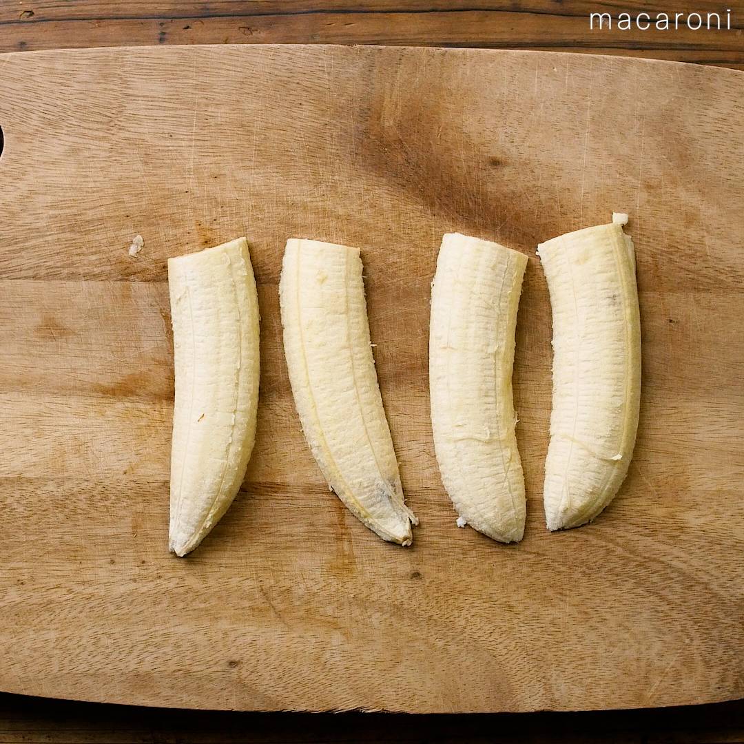 1: バナナは皮をむき半分の長さに切ります。さらに縦半分に切ります。