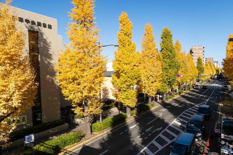 八王子市中央図書館前の歩道橋は絶好の撮影スポットです。上から見ると並木道が一直線に伸び、光の入り方によって濃淡が変わる様子もじっくり楽しめます。