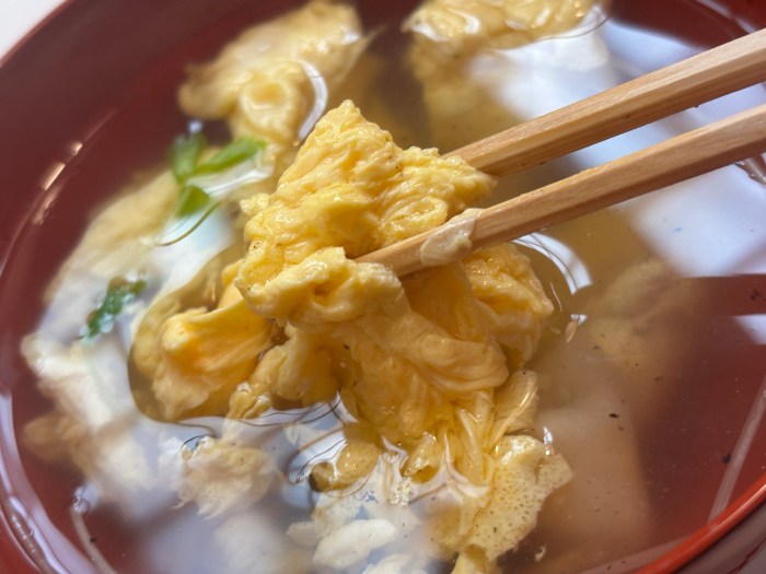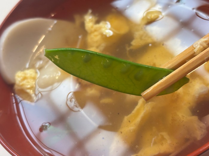 上に、ふわふわのかきたまが載っている。そのほかのトッピングは、鶏肉と絹さやくらい。