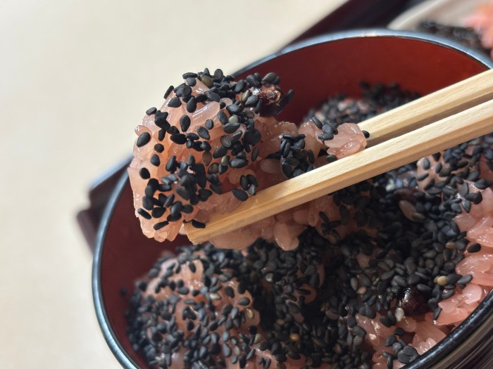 黒胡麻がたっぷりかかった赤飯自体も、薄く塩味がついててお米がモチモチだし、小豆の風味が美味しい!