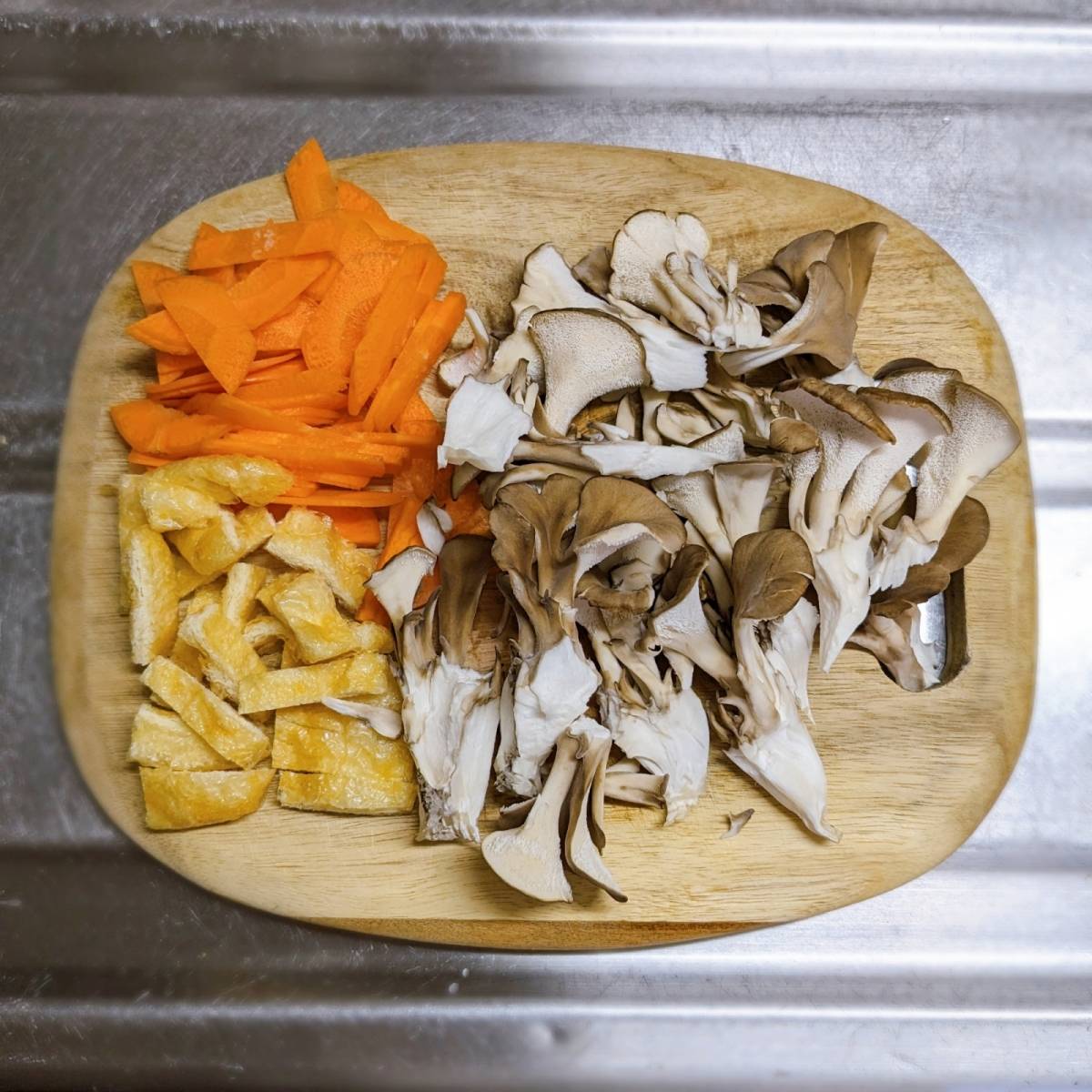 舞茸はほぐし、油揚げとにんじんは短冊切りにします。