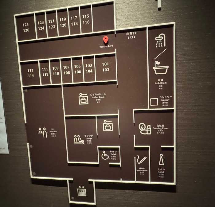 フロント横にはアメニティと自販機と喫煙所があり、すぐ女性専用エリアの入り口が出現する。「無駄、極限まで省きました!」といったムードの簡素なつくりは、さすが京都ド真ん中。