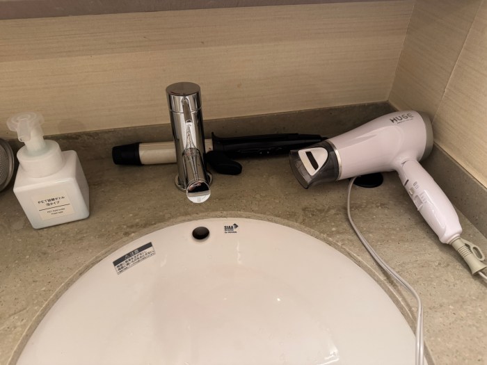 あっ、ヘアアイロンもある!! 持ってきてソンした!! 化粧ルームには洗顔、化粧水、乳液、綿棒、コットン、ヘアゴムが完備されている。座席数が5席と少なく混雑時は注意が必要だが、女子にとって過不足ない設備といえるだろう。男性エリアは見ていないので分かりません、あしからず。