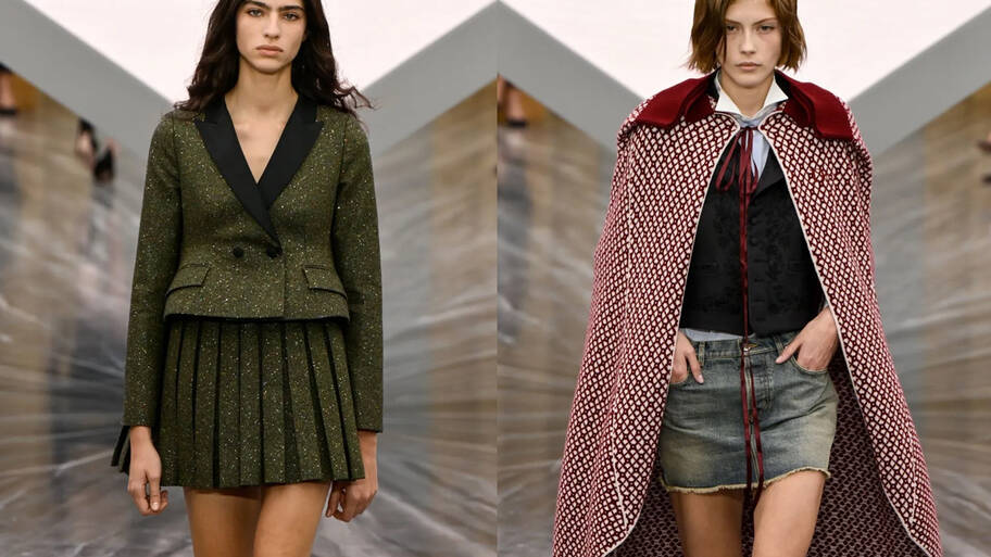 カジュアルであり、ポケットに手まで入れているが、襟元の大きなボウタイによってクラシックで凛としたムードが漂う。シャープな線が何かに似ていると思ったら、それはエディ・スリマンだった。彼がウィメンズでマイクロミニのスカートをしばしば見せたことも理由の一つだが、もっと「近い」と感じられたのは、エディが2000年代に「ディール・オム(Dior Homme)」で見せた細身のコレクションでの緊張感。会場中が息をつめて見守っていた時のような緊迫した空気が酷似している。