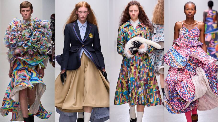 バブルドレスやフラワープリントの甘さは、抑えたカラーリングでより引き立ち、出ましたツイードのテーラードセットアップは、横から見た時のテントラインの可愛いこと!変形Aラインのミニのコートも着たい、着てみたい、できることなら欲しい。自分の体型、年齢はさておき、そういう欲望を興させる服に久々に出会ったような気がする。もちろんオトナも着られる襟ぐりの深いゆったりとドレープを描くブラウスや、やはりゆとりのあるラインが優美なワイドパンツも魅力的だ。