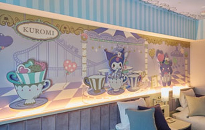 ティーポットの馬車に乗って遊園地に遊びに来た「マイメロディ」とマイスウィートピアノというコンセプトで、英国風の上品で愛らしい空間だ。
