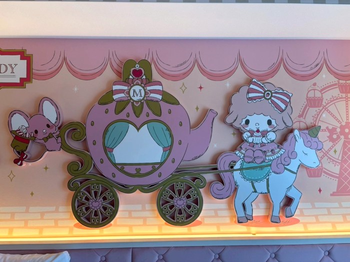 ちなみにクロミルームも遊園地でパーティの準備をしているクロミと子分のバクが可愛いいたずらを計画しているというコンセプト。キャラの魅力を存分に生かした空間が広がっていて、連泊したら確実に楽しい。