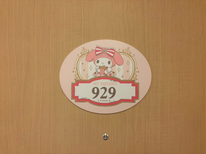 今回潜入させていただいたのはマイメロディルーム。ホテルの廊下を歩いていると現れる、マイメロ仕様のプレート。