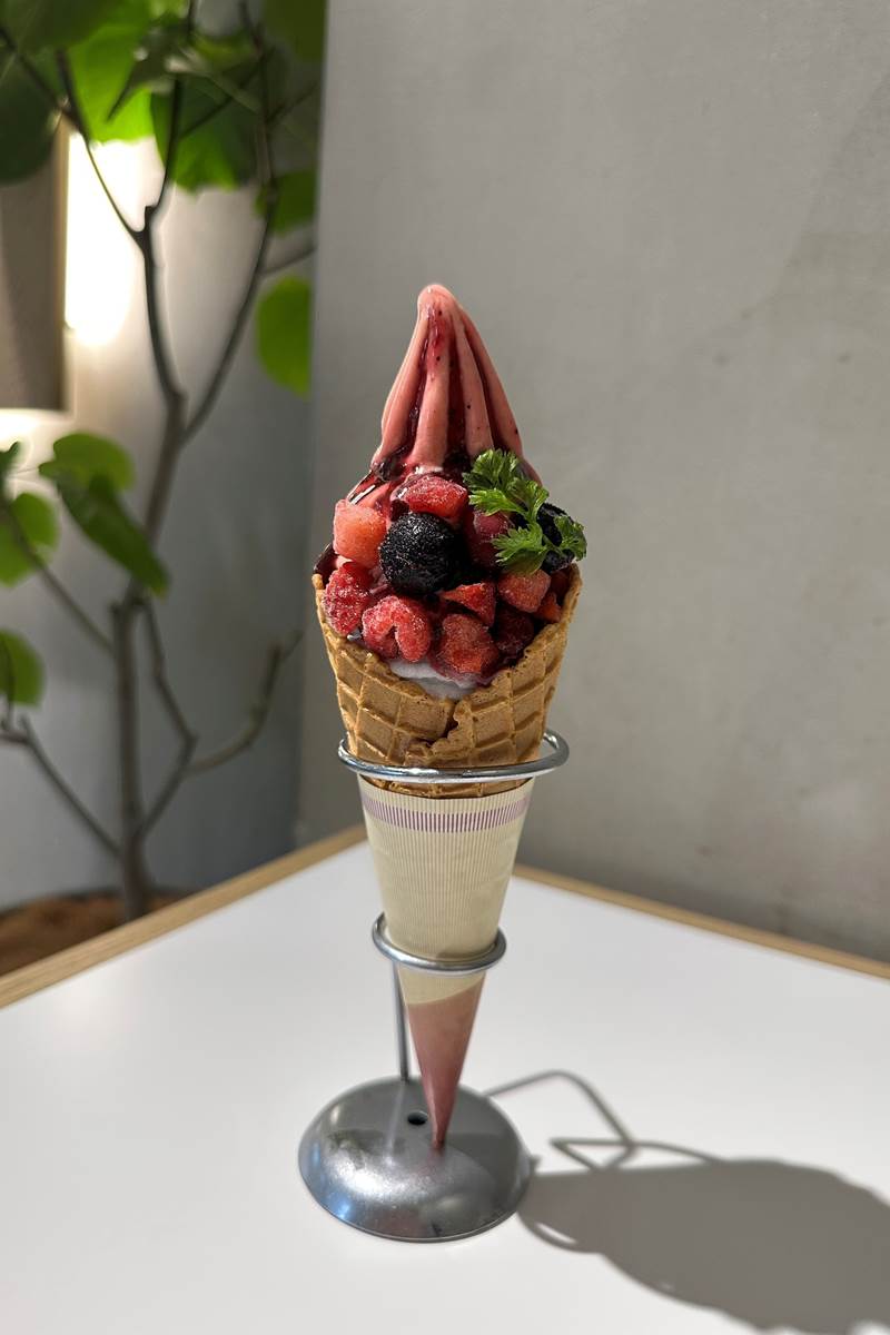 こちらのソフトクリームは、少し珍しい「豆乳ソフトクリーム」です。なめらかでヘルシーな豆乳クリームに、ライスパフの食感がアクセント。しっかりめにくるんと巻かれたフォルムが可愛らしく、SNS映えもばっちりです。テイストは「プレーン」と「抹茶あずき」、「黒みつきなこ(上写真)」の3種類。少し体を整えたい時のスイーツとしてもおすすめです。
