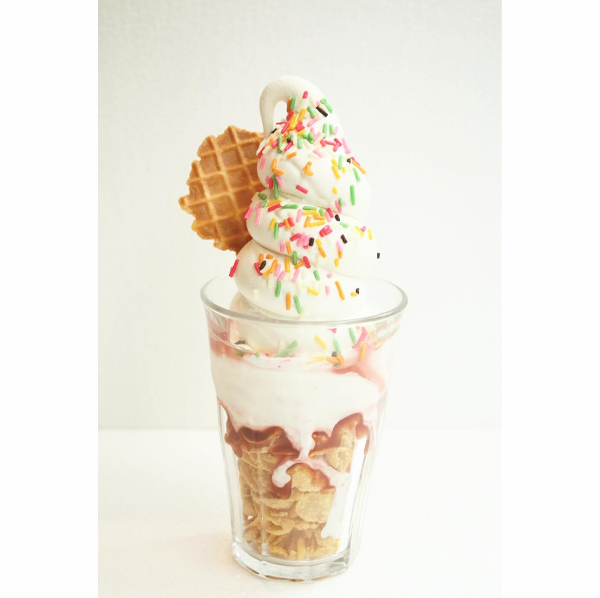 写真は大人気の「レインボーベリー味」です。濃厚なソフトクリームの中には鮮やかなベリーソースがたっぷり! どこか懐かしさを感じさせるカラースプレーのパリパリとした食感も素敵です。モコモコとした見た目もとっても可愛いソフトクリーム、ぜひお試しを。