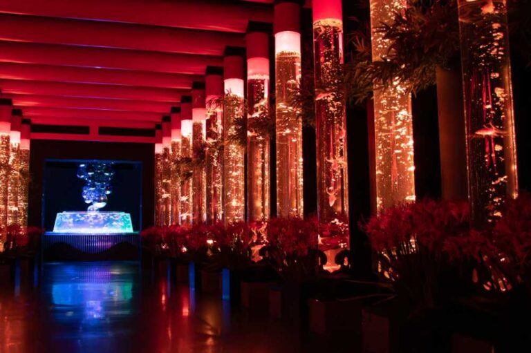 寺社建築の回廊を表現した空間では、金魚が立ち並ぶ列柱をイチョウが飾り、まるで黄金のトンネルを歩いているかのような感覚に包まれます。