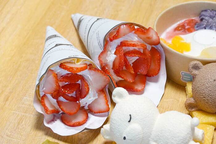 正体はクリームたっぷり&イチゴたっぷりのクレープ。プレーンとチョコの2種類ありました。