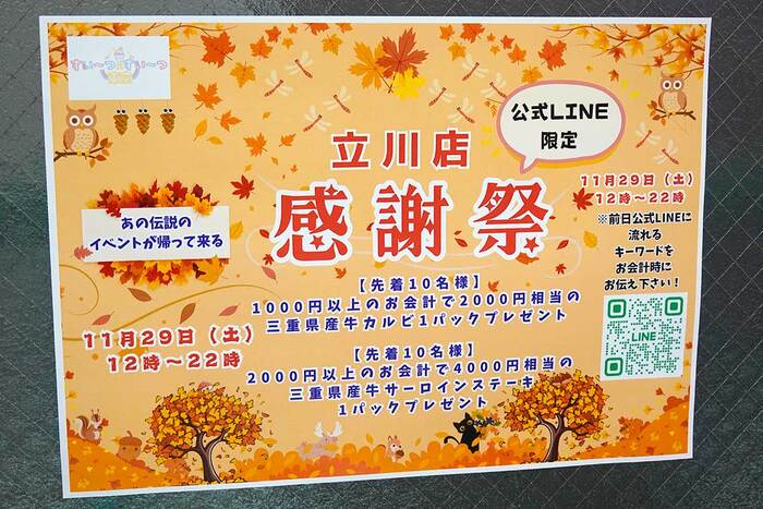 •11月28日(金)に公式LINE( https://line.me/R/ti/p/@942mohwn?ts=08261629&oat_content=url )で流れるキーワードを会計時に伝える