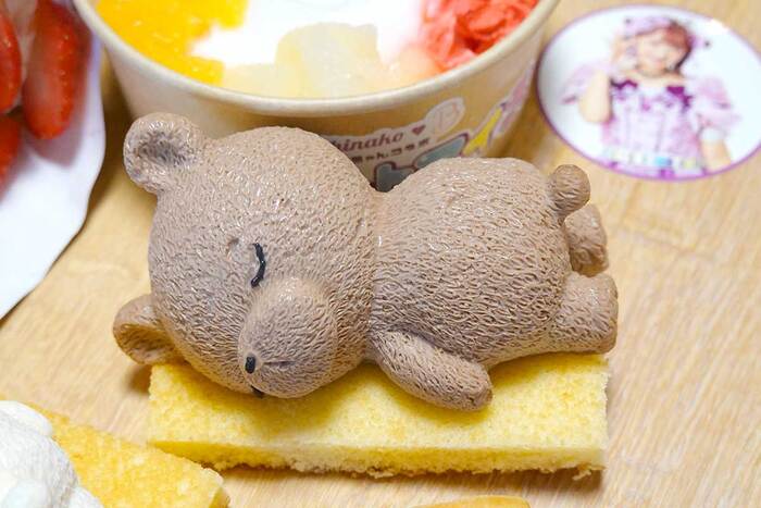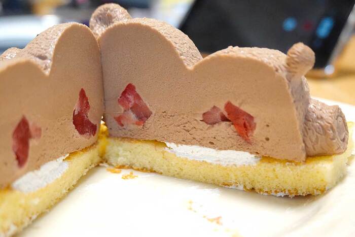 チョコの方を食べてみると、クマのムースはしっとり&甘さ控えめ。イチゴ、スポンジ、クリームと一緒に食べるとちょうどいい甘さに。