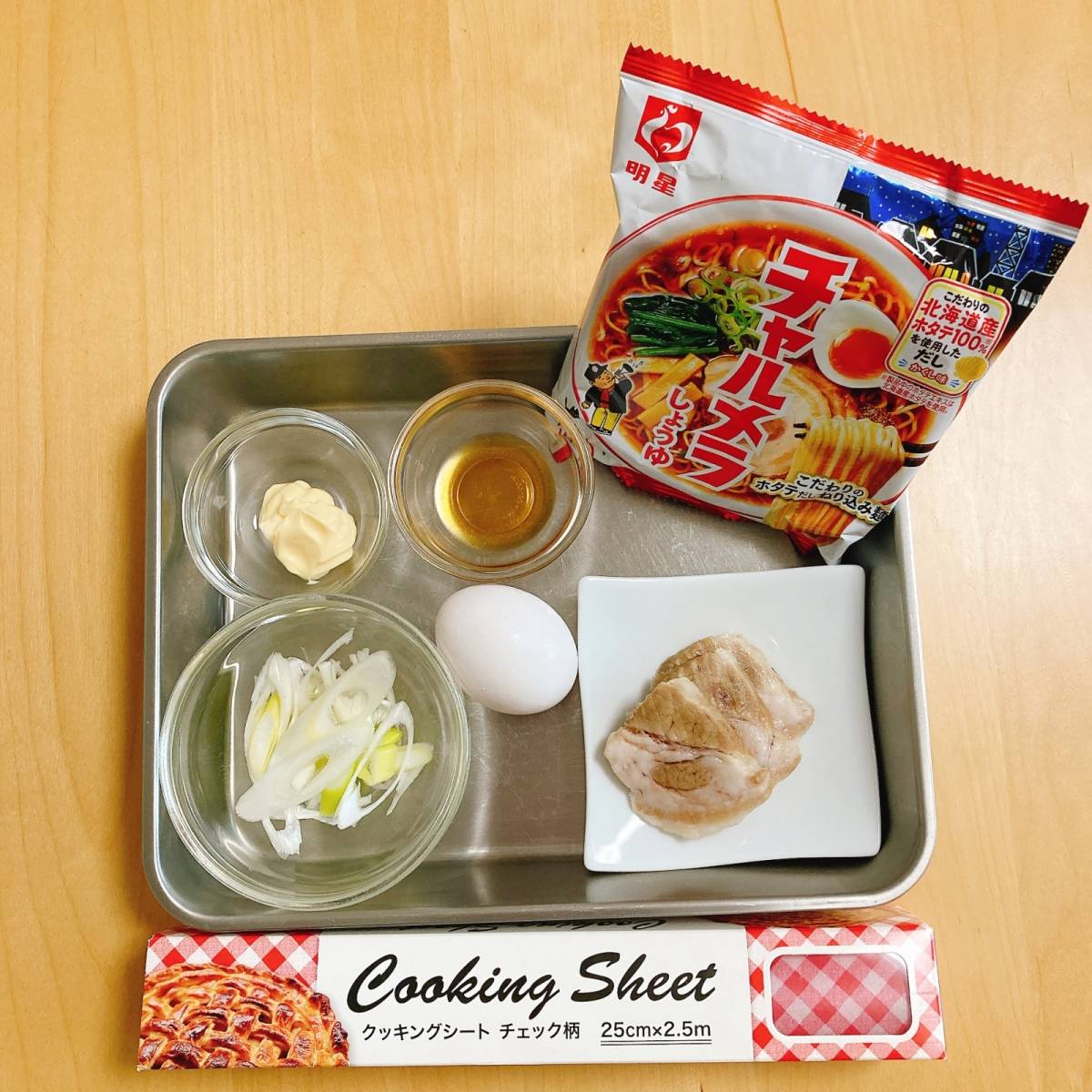 メンマ・ゆで卵・焼き海苔・ナルトは省略し、小ネギは白ネギスライスで代用です。