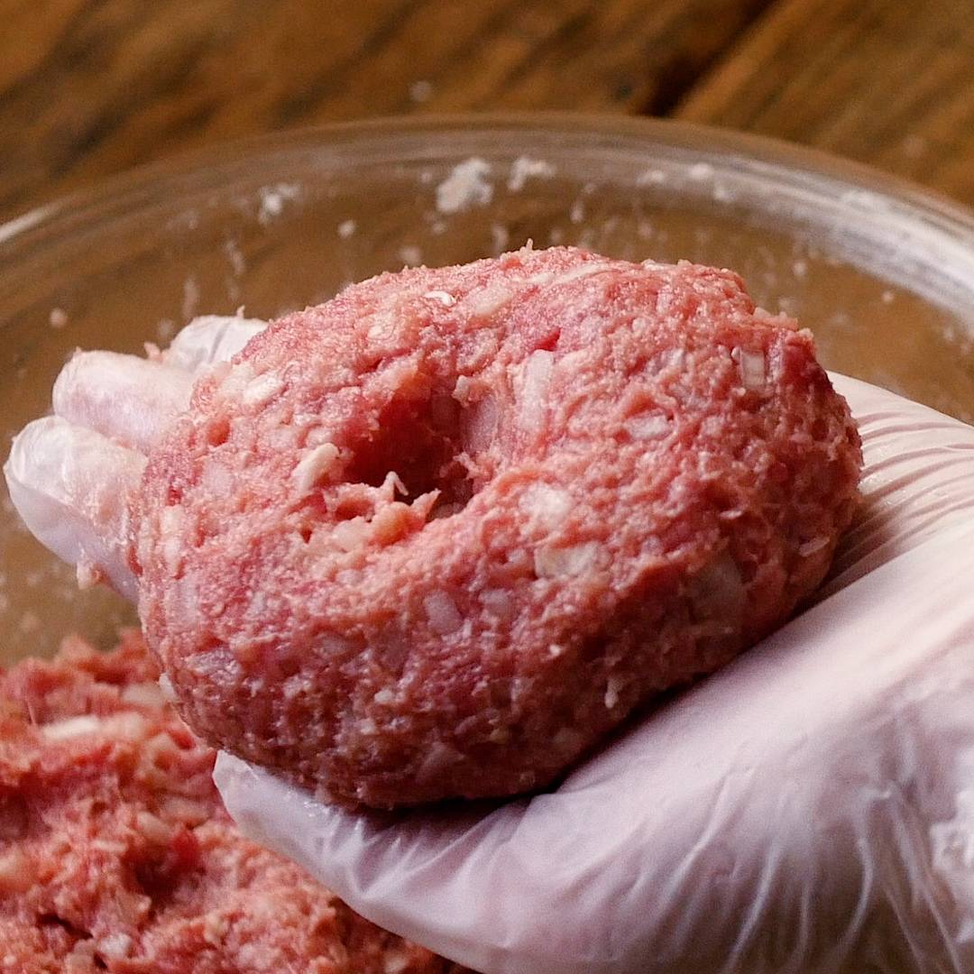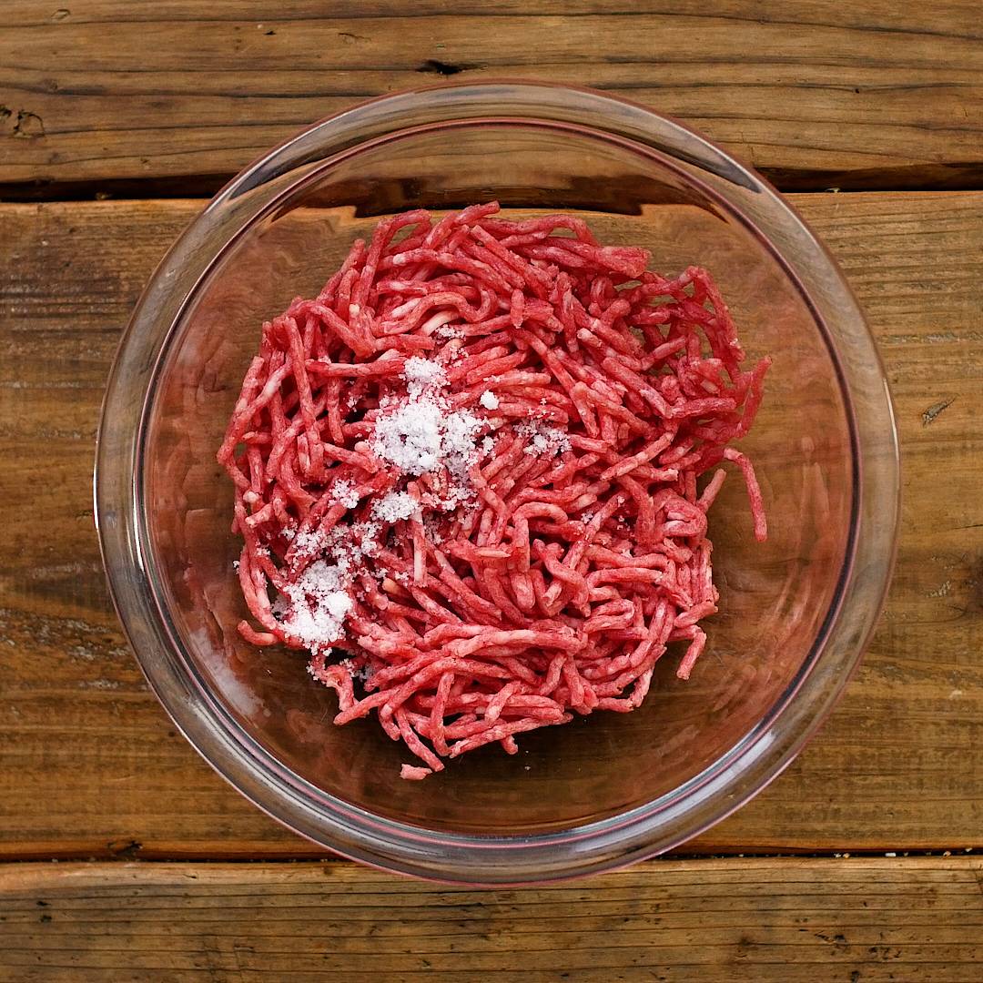 1: ボウルに合い挽き肉、塩を入れ、粘りが出るまでよくこねます。