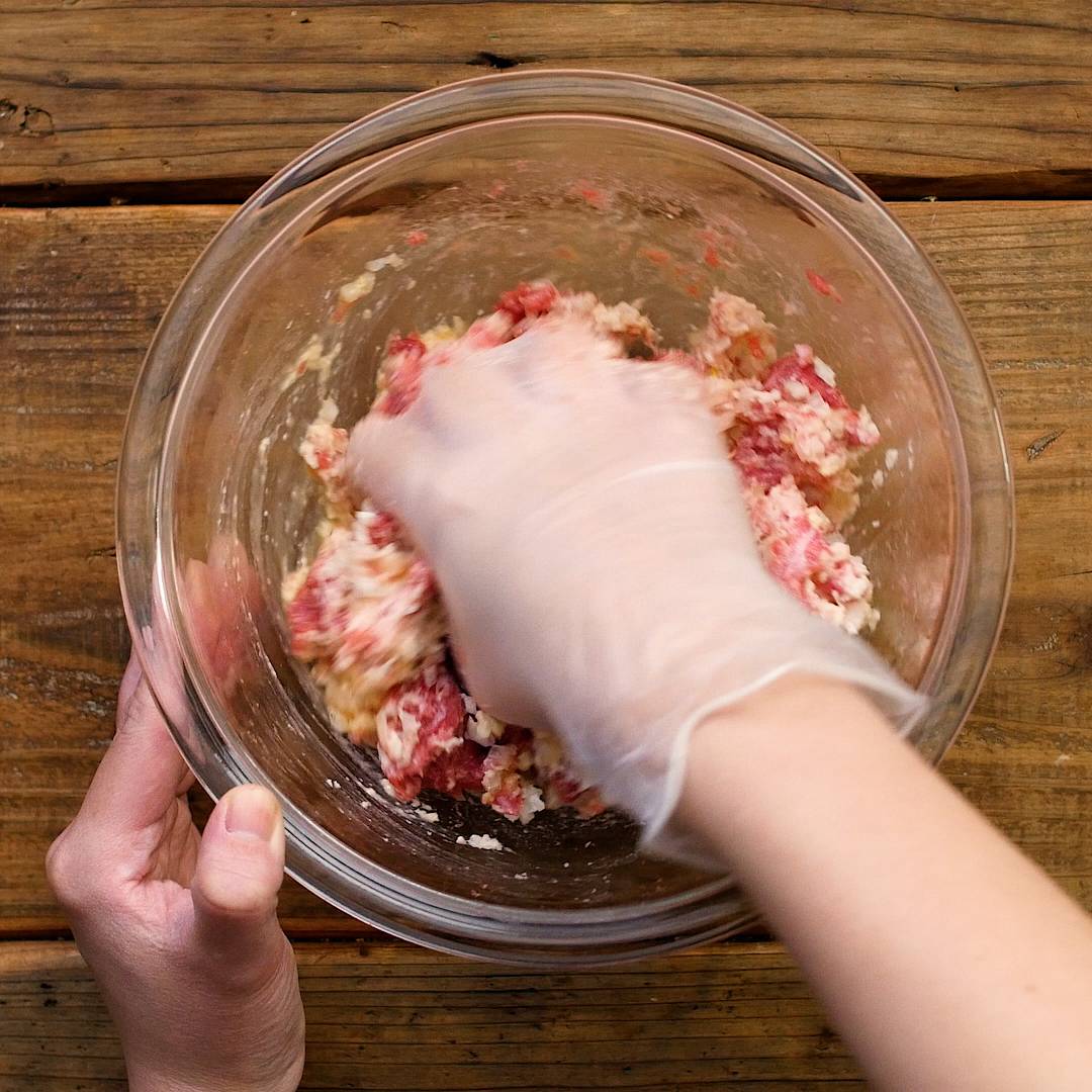 合い挽き肉に塩を加えてこねる際は、しっかりと粘り気がでるまでこねてください。このとき手は冷たい状態だと肉の脂が溶けにくいです。