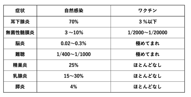 表のとおり、ワクチン未接種の自然感染では感染者の400~1000人にひとりが、治療法のない聴覚障害「ムンプス難聴」を起こすことがありますが、ワクチン接種時の副反応では極めてまれです。