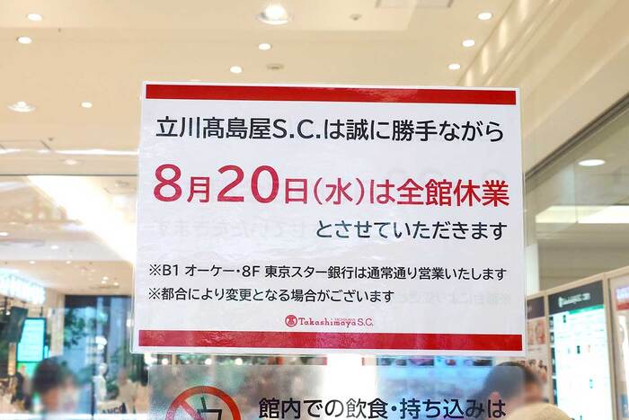 《休業》立川高島屋S.C.が8/20(水)全館休業するみたい。B1Fの『オーケー』と8Fの『東京スター銀行』は通常通り営業
