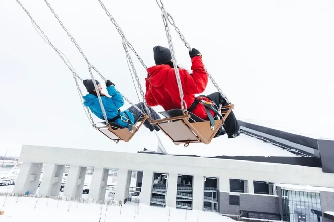 『Swing Max』は、高さ8mのデッキから大型ブランコに乗って空へ駆け上がる爽快感が味わえるFビレッジの人気アクティビティ。冬の北海道の雄大な景色と、この時期だけの雪化粧したエスコンフィールドを楽しむことができます。