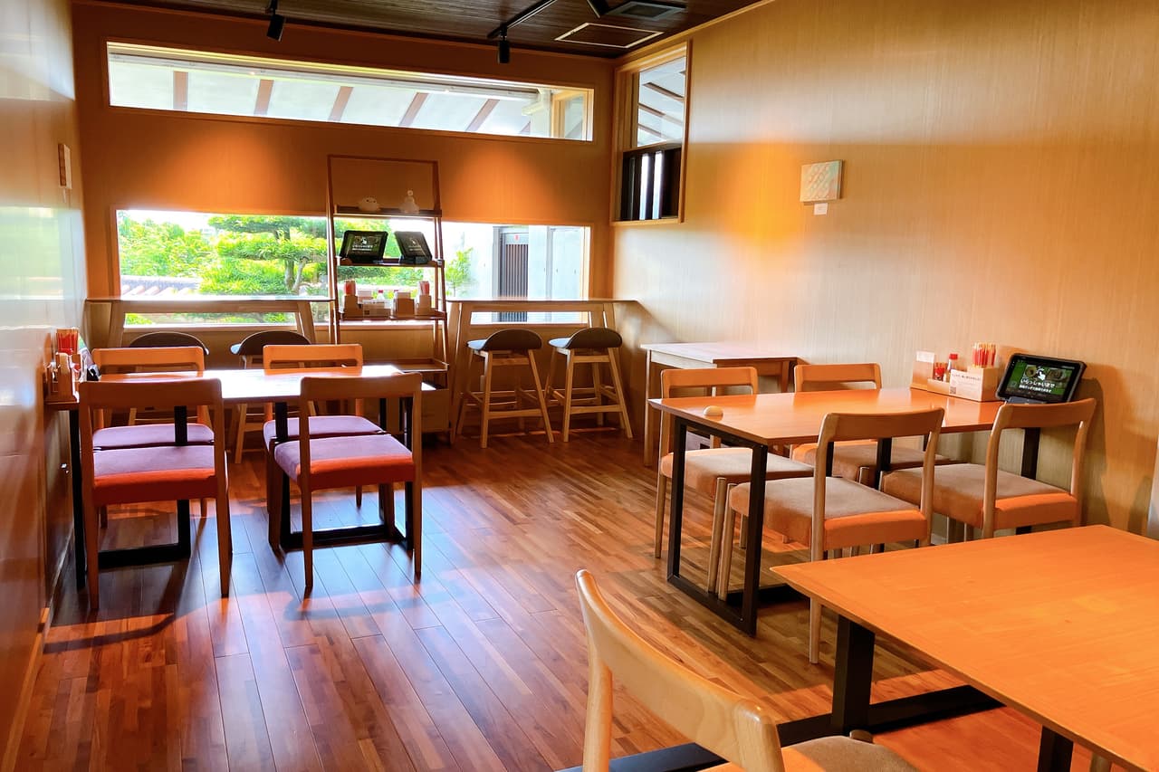 温かな照明と木の家具のテーブル席で、ゆったりとした時間を過ごせます。