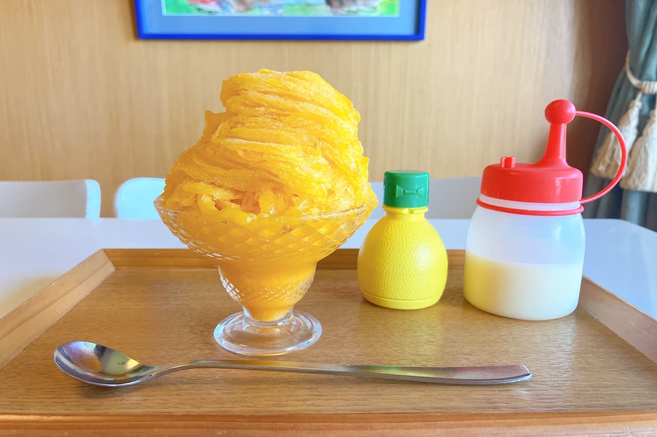 マンゴー農園直送。氷不使用、マンゴー丸々2つを使った「てぃーち」名物マンゴーかき氷