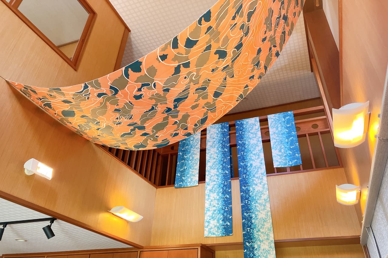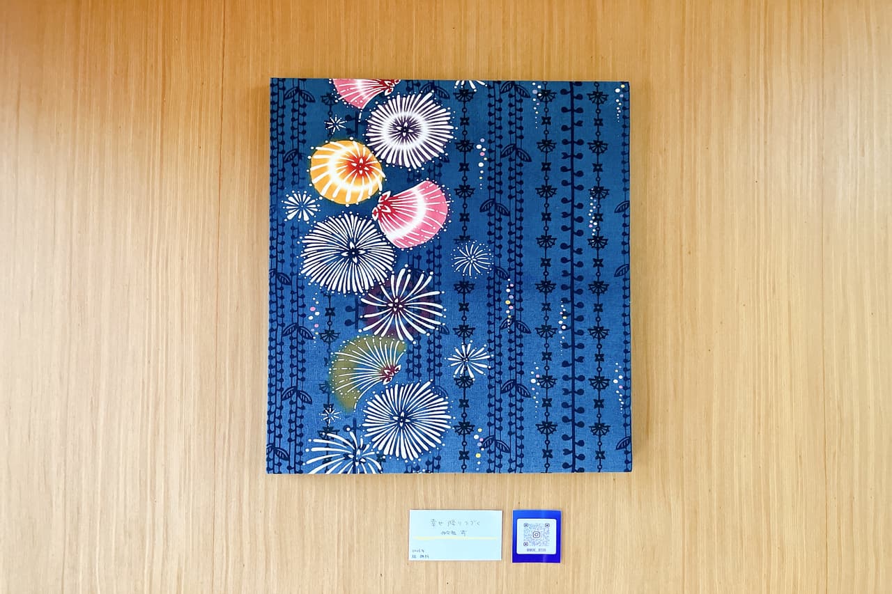 店主・大城勝太さんの原動力は、「沖縄のアーティストを応援したい」という想いにあります。ご自身も首里高校の染織デザイン科を卒業し、県外の美大へと進学。学生時代から同級生や仲間に恵まれてきた経験が根っこにあるのだそうです。 店内には、沖縄県立芸術大学の学生や大学院生による作品が飾られています。暖簾やコースターといった小物にも沖縄の伝統が息づき、細部にまで地域文化への敬意が込められています。 取材時(2025年8月)は展示会の最中で、紅型や花織といった染め織り作品がならび、その出展者の多くは県立芸大の染織カリキュラムを修了した若者たちでした。そのなかの一人は、現在「城間紅型」の職人として活躍しています。 展示されている作品を前にすると、ただうつくしいだけでなく、若い店主の願いと作家たちの歩みが織り込まれているようで、店内の空気まで明るく感じられました。