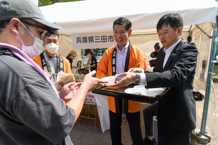 ブースでは三田米の試食も行われ、両市長が来場者に炊きたてのご飯を配っていた。試食した市内の男性は「新潟の米と遜色ない。とてもおいしい」と話していた。