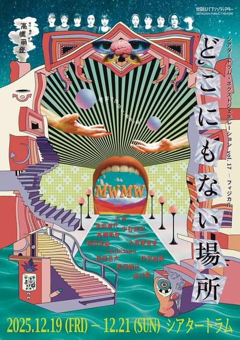 今回上演する『どこにもない場所』は、人の気配のない空間でありながら、妙な懐かしさや不安を感じる場所としてSNSなどで注目を集めている〈リミナルスペース〉をテーマに、「ここでもない、あそこでもない」曖昧な場所と人とのつながりを描く。 今作の上演にあたって、二度にわたるワークショップオーディションを開催。高橋をはじめとするMWMWのメンバーに加えて、ストリートダンサー、ジャグラー、俳優ら多彩な出演者が揃った。新しい才能の出会いと交錯が、観客を新たな世界へと導く。