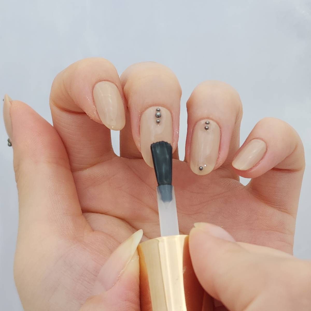 メタルパーツは小さいつぶつぶなので、ピンセットでつまみにくい場合は先端にベースコートを少し付けるとくっついてくれますよ。