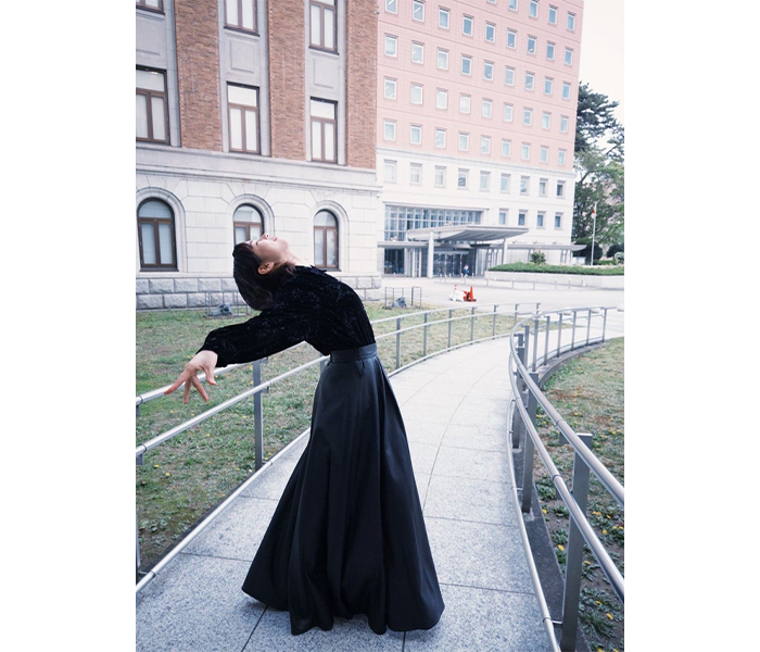 黒のロングスカートを合わせたブラックコーデで、大きく足を蹴り上げる豪快なオフショットを公開した。